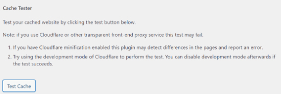 To verify that the cache is functioning, turn it on. Scroll down to the Cache Tester section. Click on the “Test Cache” button.